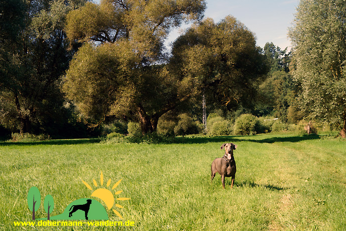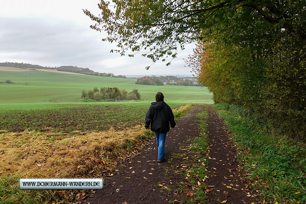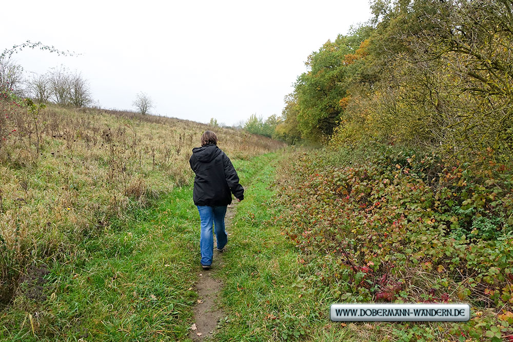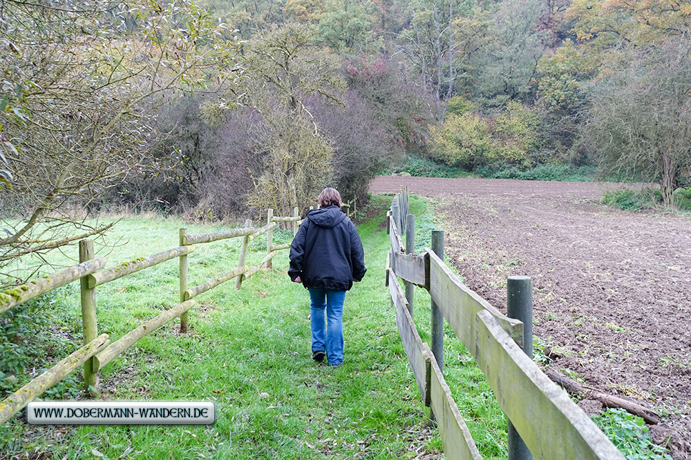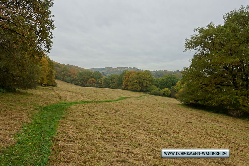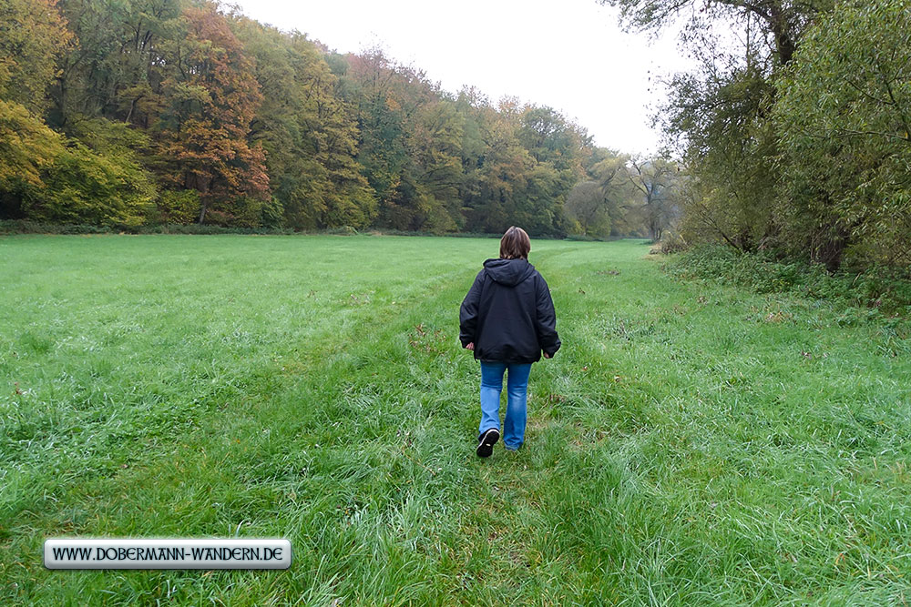 Es geht nun geschwungen auf einem Wiesenweg hinab an die Nette und parallel dazu auf einem weiteren Wiesenweg weiter.