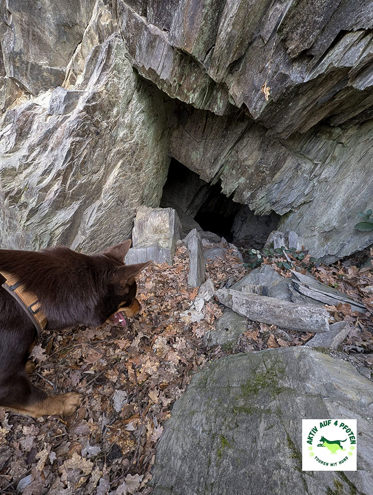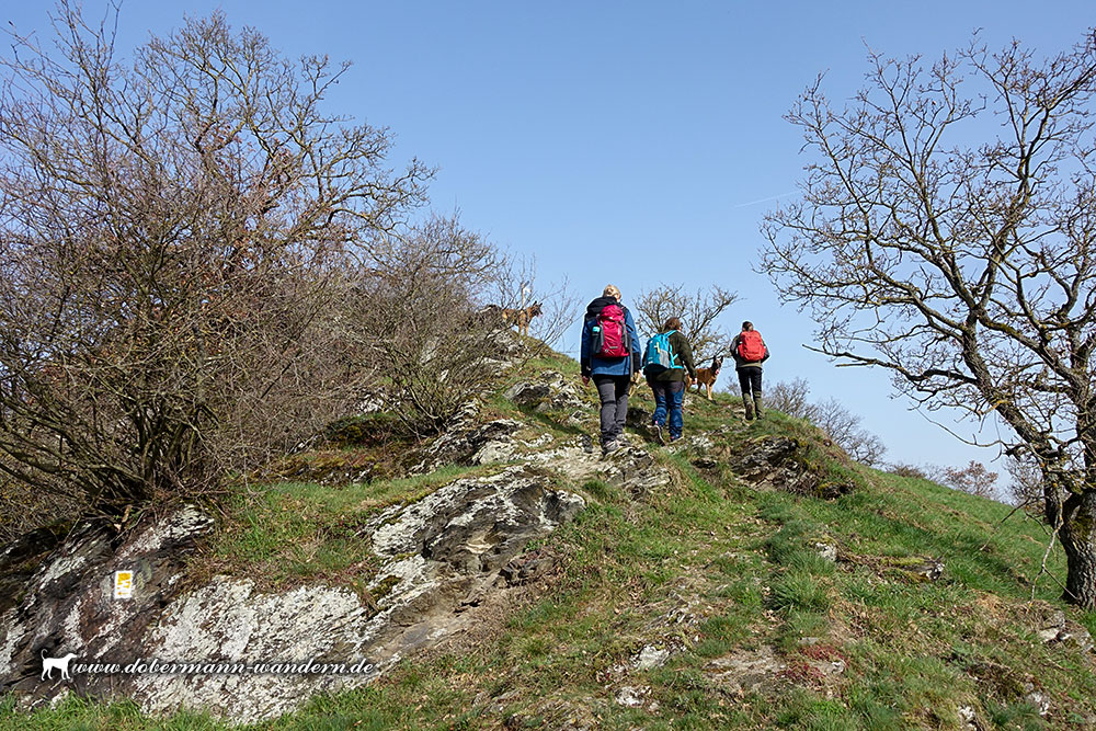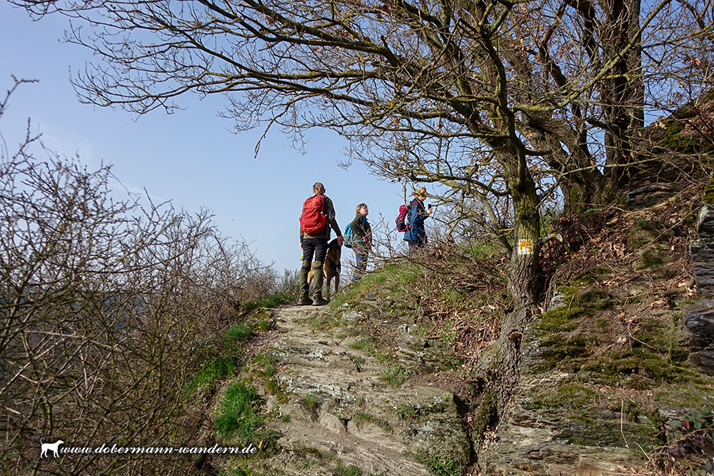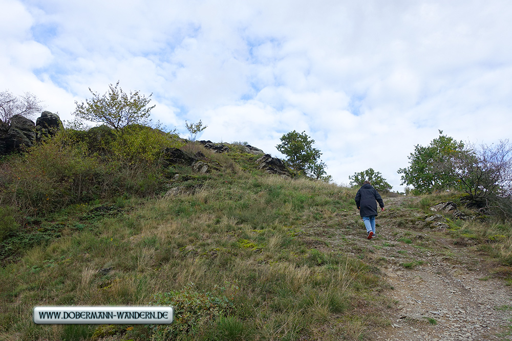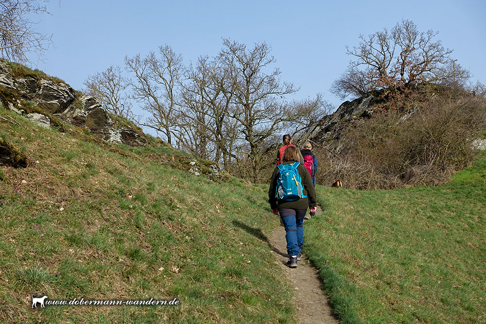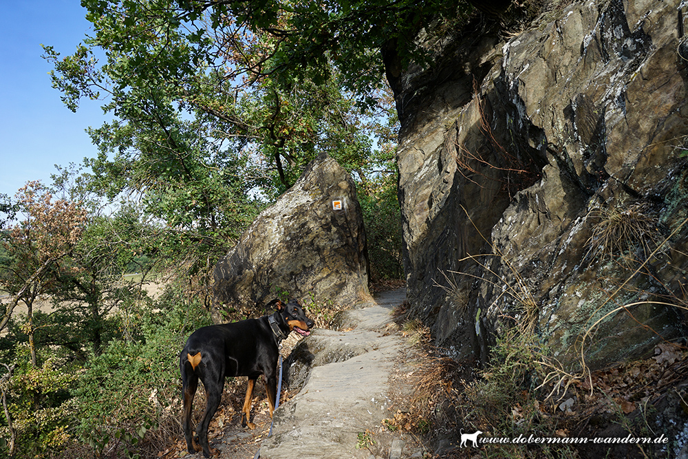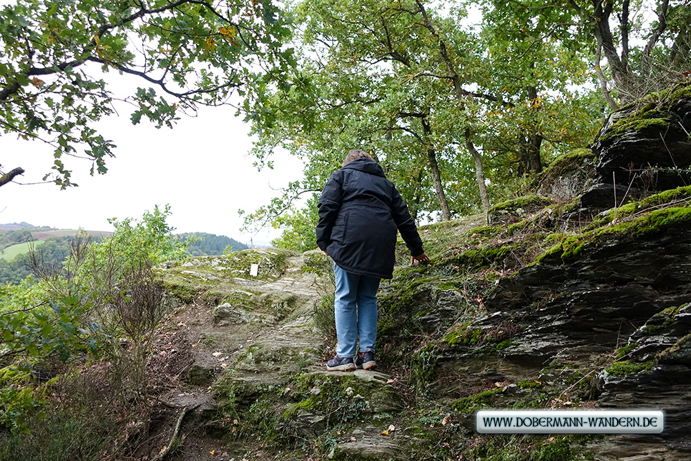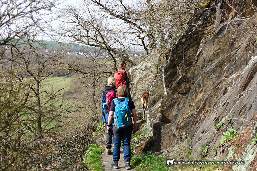 Entlang eines ehemaligen Weinbergs und dem „Barbaraweg“ geht es am Fels vorbei an der ehemaligen Schiefergrube hinab.