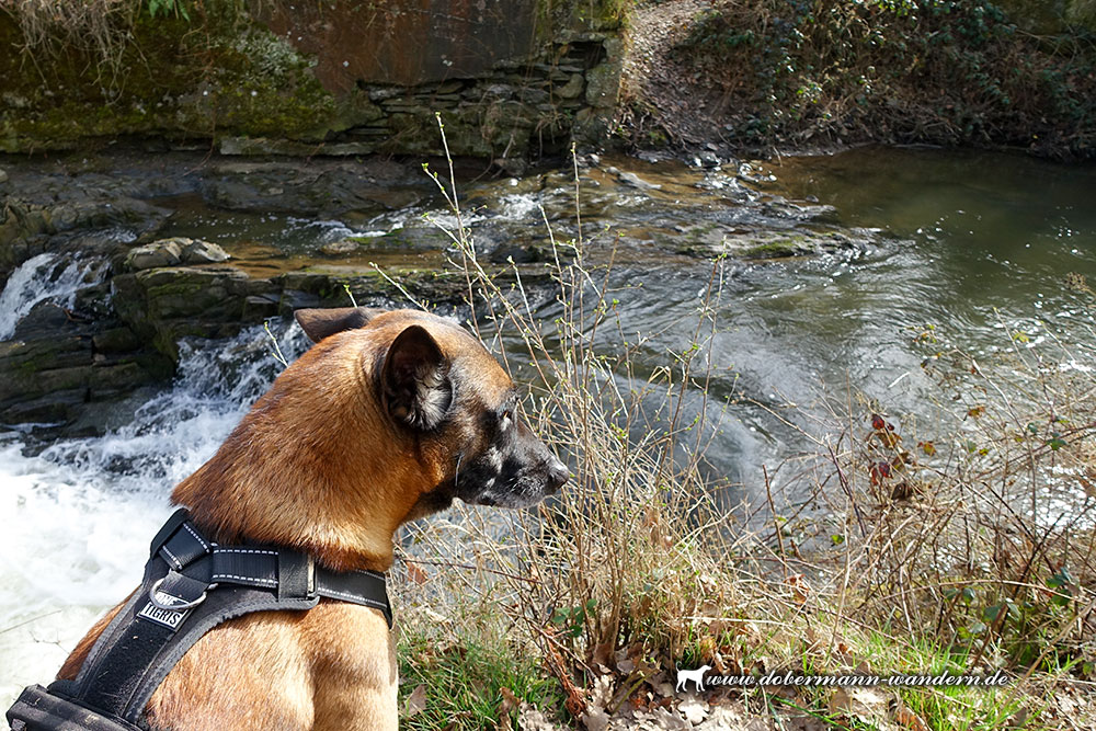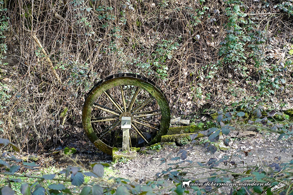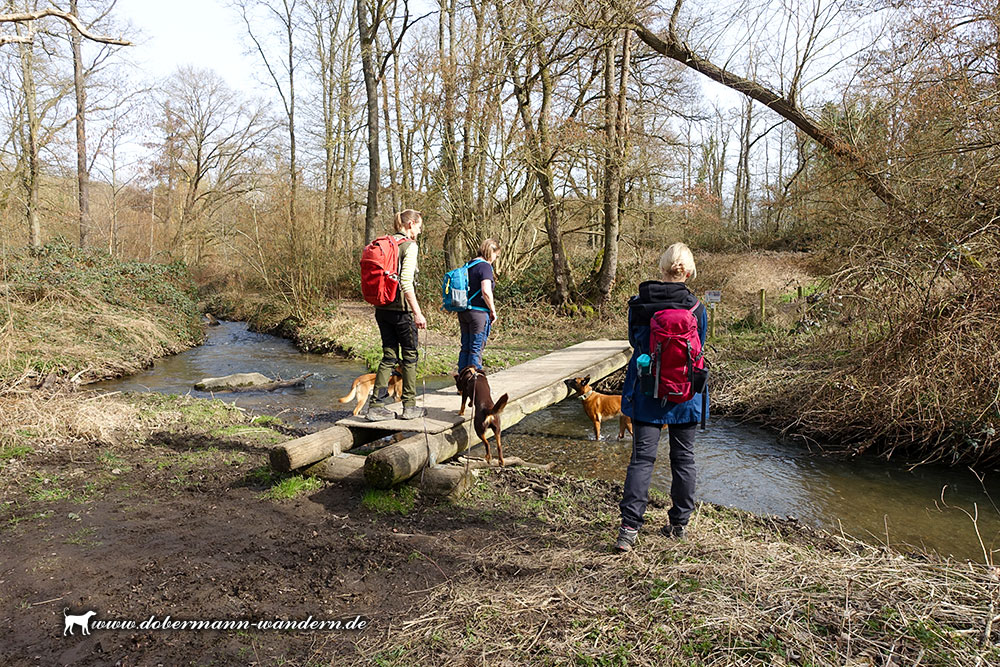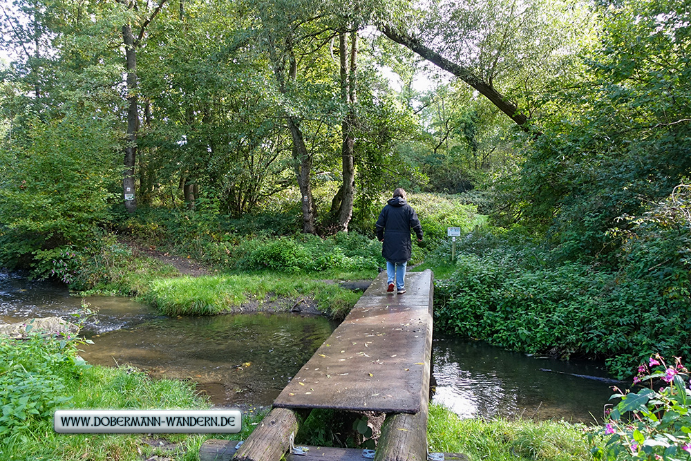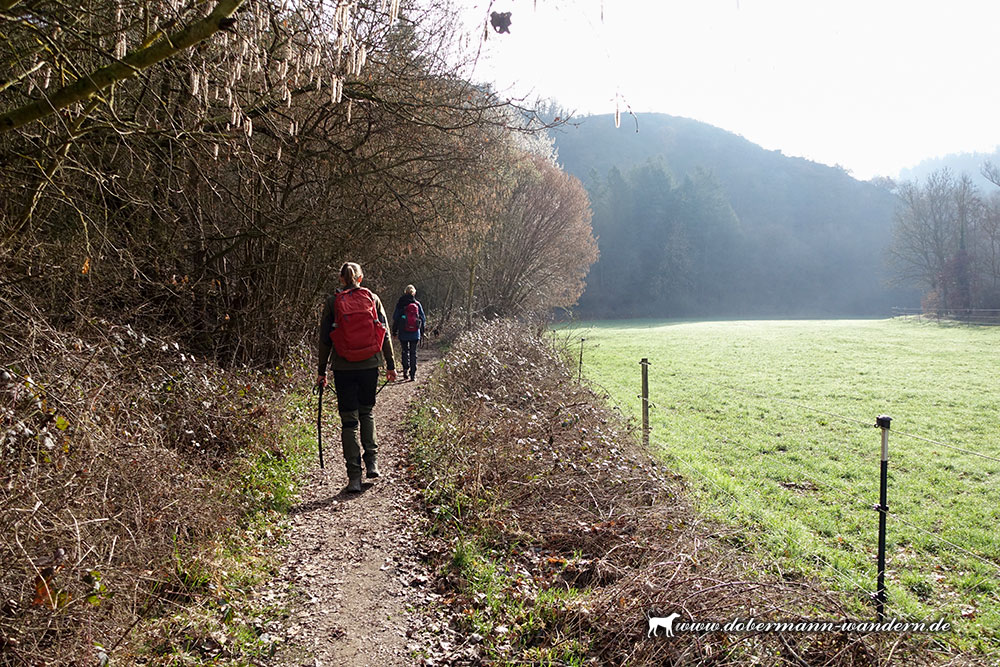 Nach dem überqueren einer weiteren Brücke halten wir uns rechts und werden so zunächst ein längeres Stück am Uferrand der Nette und später in die Höhe geleitet.
