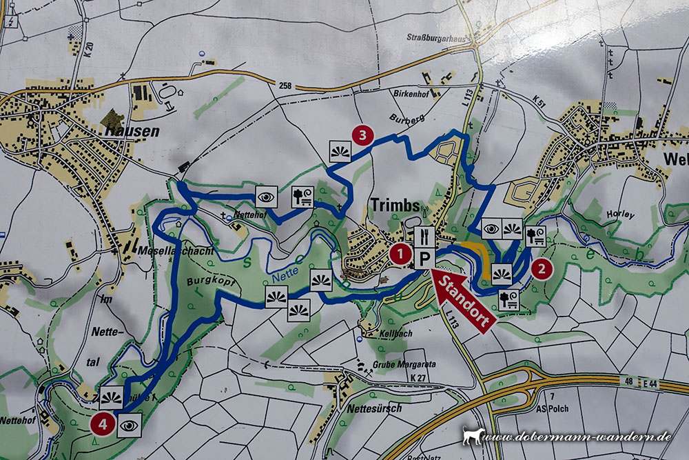 Wir starten am ausgewiesenen Wanderparkplatz in Trimbs, gehen über die steinerne Brücke über die Nette und gehen am Ortsende im Gegenuhrzeigersinn zunächst an ihr entlang.
