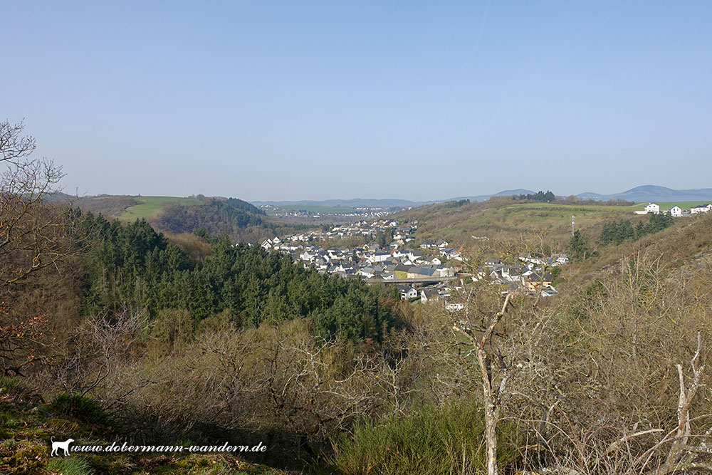 Es wird noch einmal „anstrengender, bis wir auf ein Plateau stoßen und am Burgberg noch einmal auf Trimbs hinabschauen, bevor es auf einem schmaleren Pfad hinab in den Ort und zu dem Wanderparkplatz geht, wo wir dann die schöne Rundwanderung beenden.