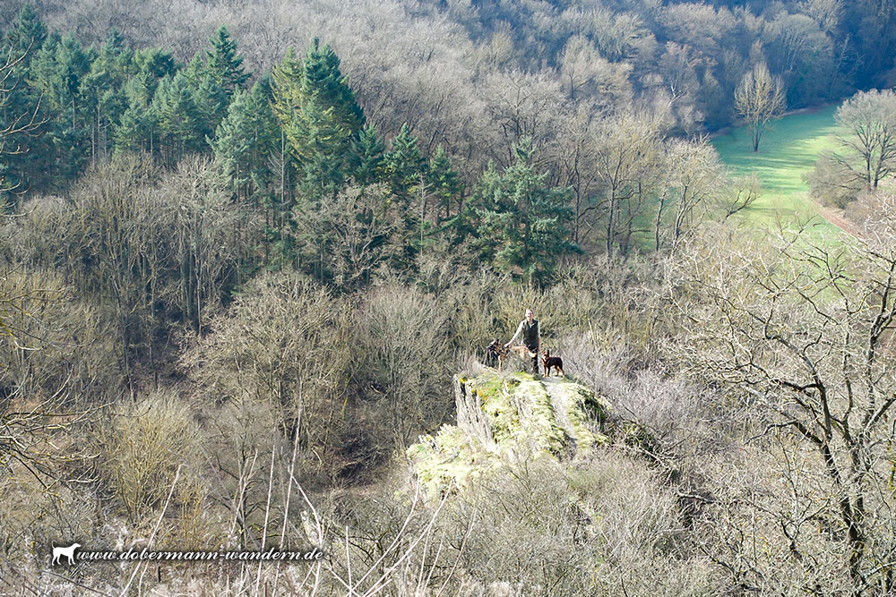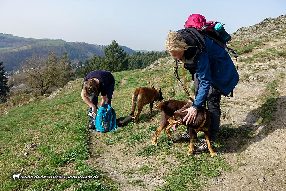 Alsbald haben wir schon die erste Hälfte der Wanderung unter den Sohlen / Pfoten, so dass sich eine Vesperpause am Rast- und Aussichtsplatz „Kretzer’s Ley“ mit wunderschöner Aussicht und Ruhe anbietet.