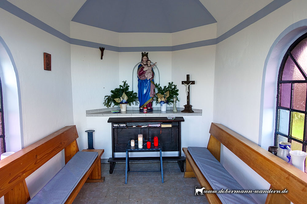 Im Inneren der in der Regel verschlossenen Kapelle steht auf einer Altarnische eine Madonnenfigur mit Christuskind auf dem Arm.