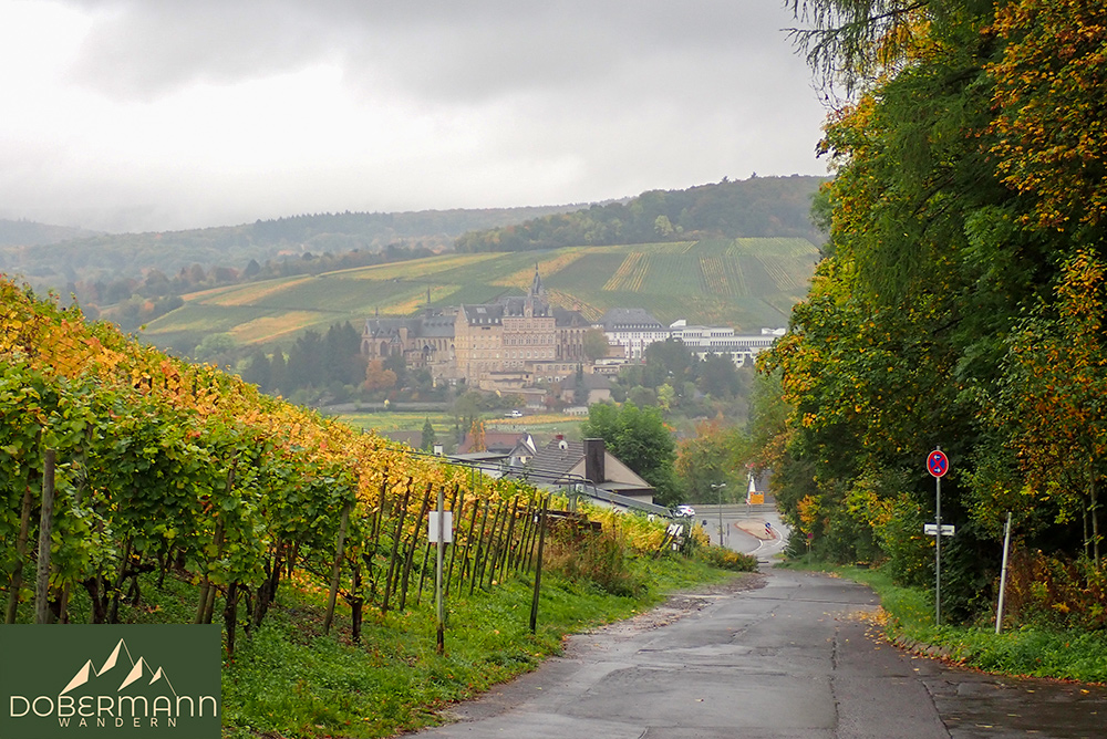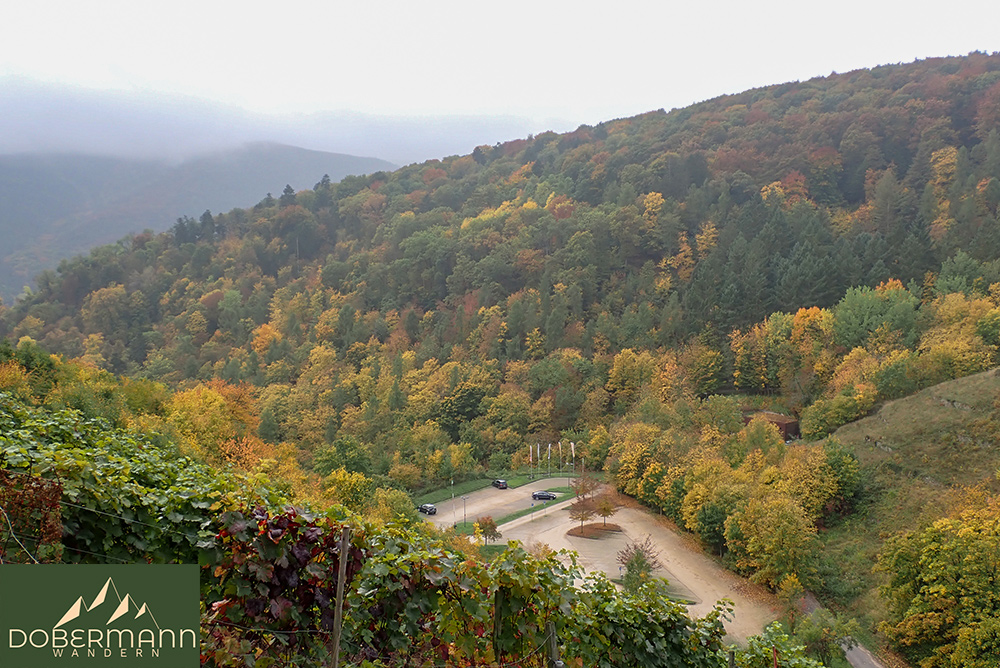 Der Ausgangspunkt der Rundwanderung [Gegenuhrzeigersinn] startet wie häufig auf dem Wanderparkplatz oberhalb der Römervilla mit Blick auf das ehemalige Kloster Kalvarienberg.