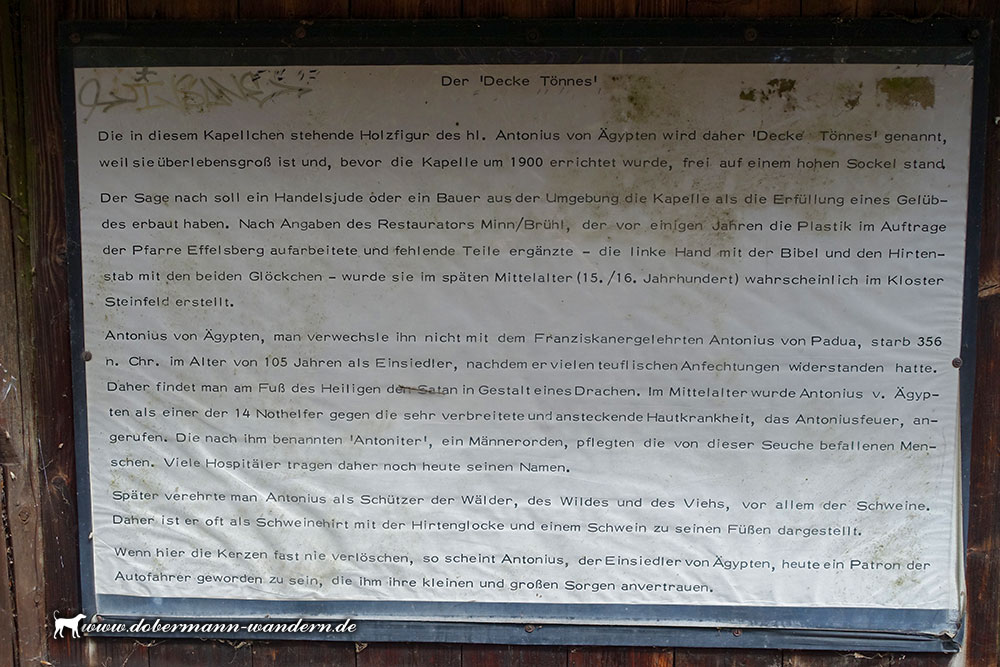 In der Waldkapelle „Decke Tönnes“ im Münstereifeler Wald zwischen Bad Münstereifel und Effelsberg steht eine Holzfigur, die den Heiligen Antonius von Ägypten darstellt.