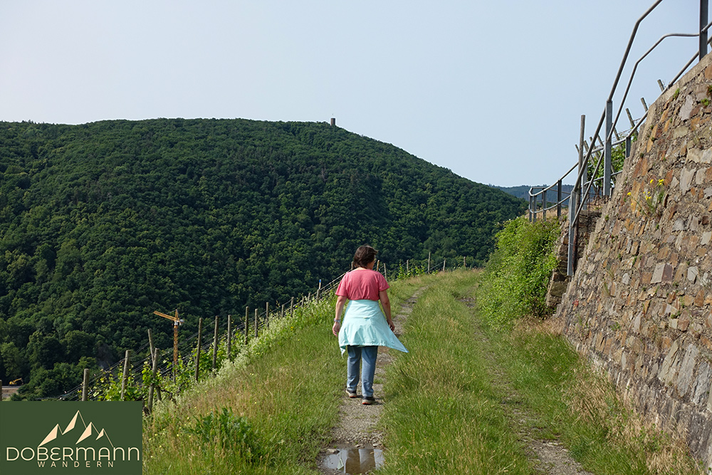 Oberhalb des Ahrtals geht es jetzt in Richtung Dernau weiter. Vor uns und auf der anderen Uferseite ist der Aussichtsturm des Krausberg zu erkennen.